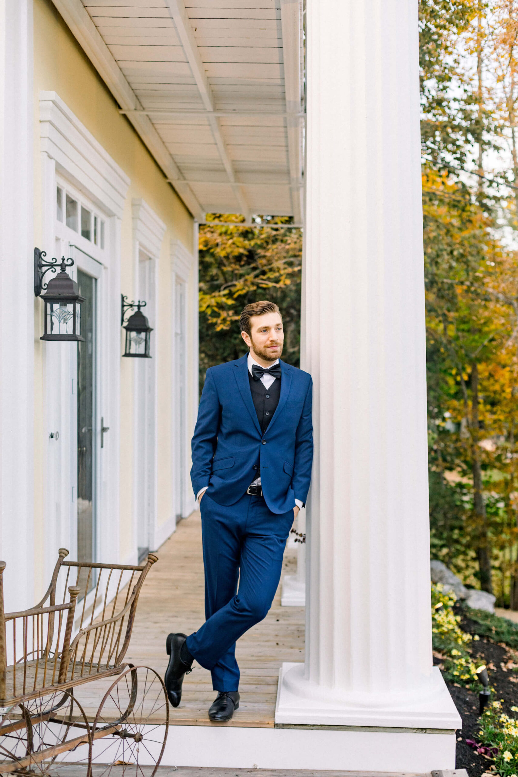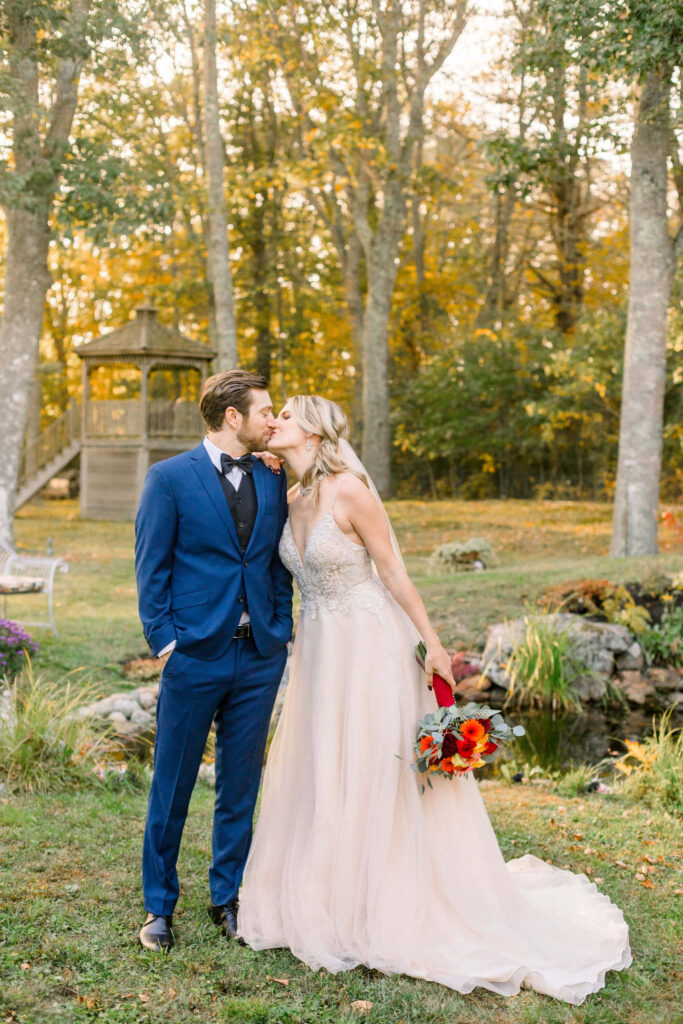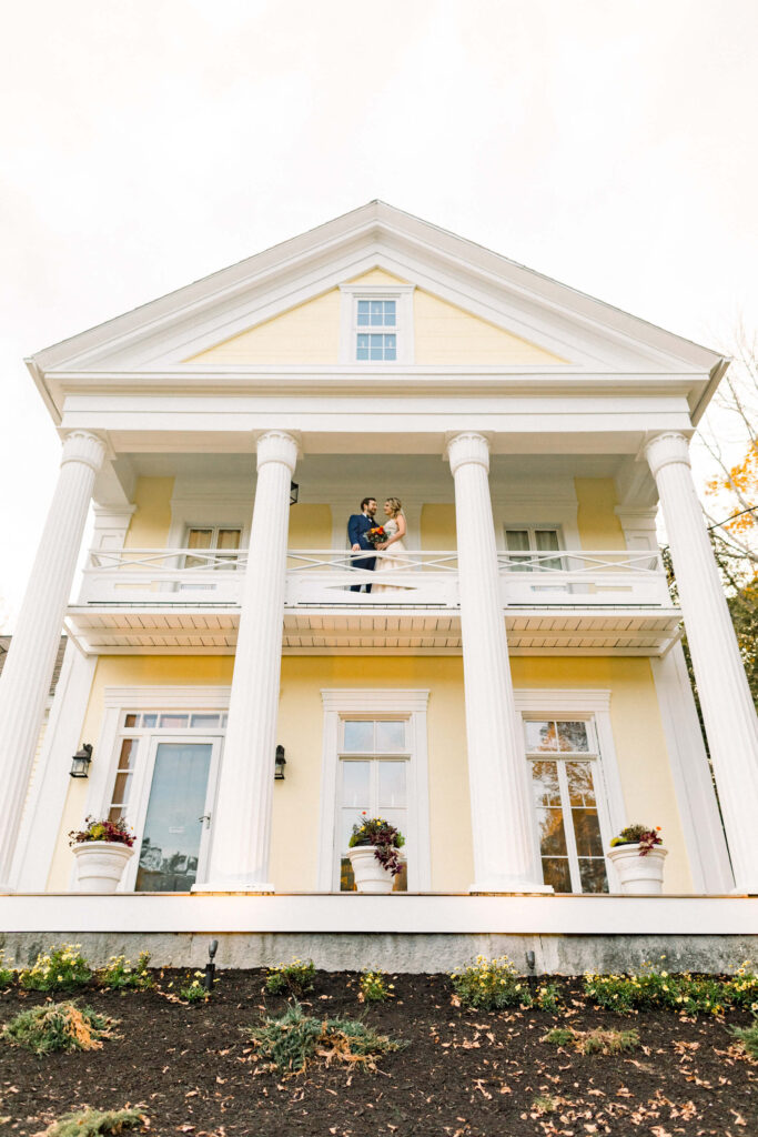 "Newlywed couple sharing an intimate moment on the elegant porch of The Emerson House Inn in Orland, Maine; the bride in a flowing wedding gown with a vibrant bouquet, and the groom in a classic blue suit."